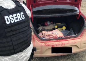 Del registro que personal policial realizó al Mitsubishi, L-200, negra, dominio HOK-044, se secuestraron los siguientes elementos: tres vainas servidas, un cuchillo, siete cartuchos de bala, una carabina, 20 cartuchos de bala .380, una carabina neumática, un costillar vacuno, una paleta completa, entre otros cortes de carne.
