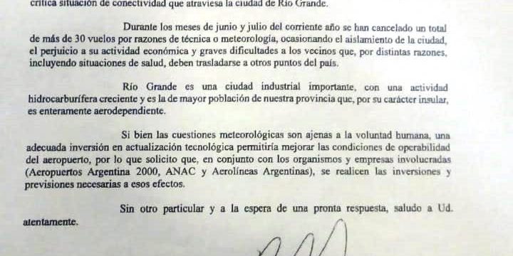 “Si bien las cuestiones meteorológicas son ajenas a la voluntad humana –continúa la nota- una adecuada inversión en actualización tecnológica permitiría mejorar las condiciones de operabilidad del aeropuerto, por lo que solicito que, en conjunto con los organismos y empresas involucradas (Aeropuertos Argentina 2000, Aerolíneas Argentinas y ANAC) se realicen las inversiones y previsiones necesarias a esos efectos”.